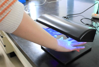 学生たちはしっかり洗ったつもりでも、爪の周りや手首など様々な箇所に洗い残しがあり、何度も洗い直しをしていました。