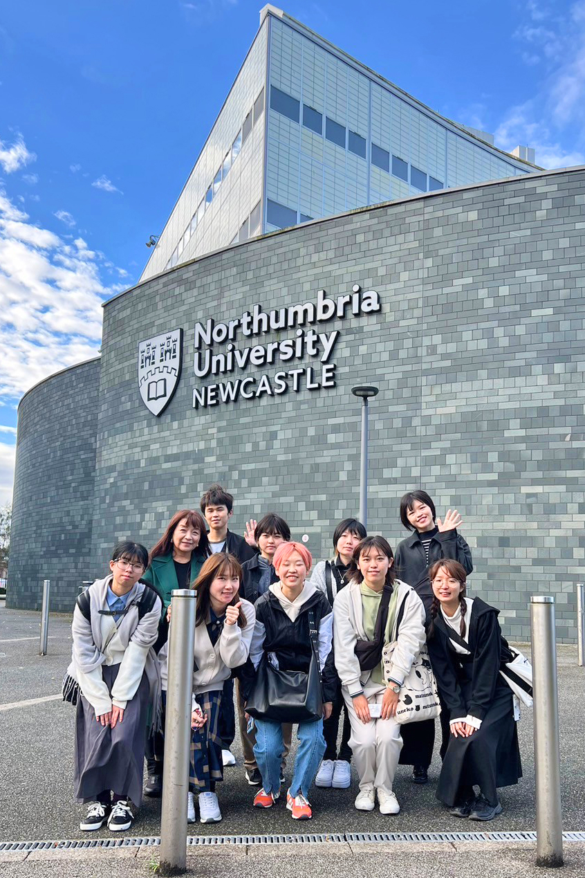 2003年にスタートしたデザインアートコースの英国ノーサンブリア大学へのアート・英語研修は今年度で12回目。11回目の前回は2020年のコロナパンデミック禍で全世界的なステイホームのなか、完全オンラインで実施。2018年の現地研修から6年の歳月を経て、ようやく実現した英国現地での研修となりました。世界的な物価高騰の煽りを受け、今年は日本国内でオンライン研修を4日間、ノーサンブリア大学での現地研修を5日間実施。オンライン、現地それぞれを合わせると11名のデザインアートコースの学生が参加しました。全員が初めての海外渡航。目にするもの全て新鮮で日本とは違う考え方や文化に衝撃の連続。英語でのコミュニケーションに悪戦苦闘しながらも非常に充実し成長できた研修となりました。