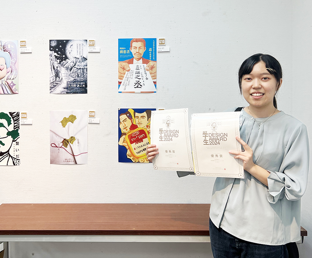 香川県内で活躍する様々な分野のデザイナーやクリエイティブな仕事に就く個人や企業の交流団体『Creators Club Takamatsu (CCT)』が主催する、CCT学生DesignAward2024にて、デザインアートコース2年生の川上真由子さん、同コース2年生の藤原紗那さんがそれぞれ優秀賞を受賞しました。2024年の課題は「偉人を広告する」。四国新道の建設、香川用水や瀬戸大橋構想の提唱など数多くの四国発展の礎を築いた大久保諶之丞を宣伝するポスター制作で、設定されているストーリーを参考にデザインのクオリティを高めていきました。