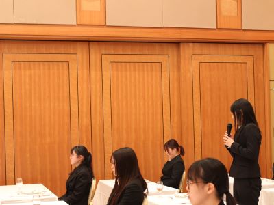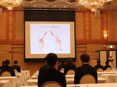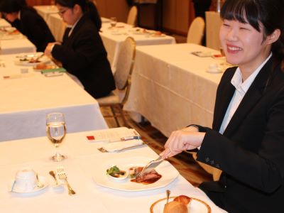 昨年度に続き、高松国際ホテルにてスタッフの方のご指導のもと、一人ずつ着席し、「ナイフ・フォークの使い方」、「食事の心構え」など、実際にコース料理を食べながら食事のマナーについて学びました。
