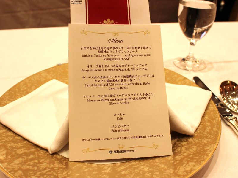 前菜に用いられている「百年はまち」とは、引田ではまちの養殖が始まり約百年の歴史があり、その歴史を次の百年につないでいくという想いが込められているそうです。見た目も鮮やかで脂がのっていてとてもおいしかったです。ほかにも地元の食材を使ったコース料理を堪能しました。