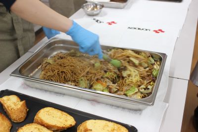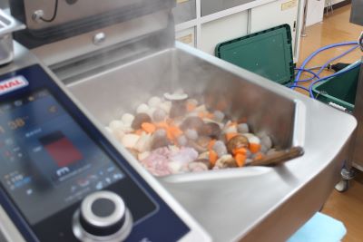 体験会では、スチームコンベクションオーブン、i-Vario(バリオ)が用意され、メーカーご担当者様(株式会社ラショナル・ジャパン)からの説明と実演がありました。いずれも多様な加熱調理を一台で担う機器で、レストラン、学校、保育園、福祉施設、社員食堂等で広く導入されています。体験会では、最新の大量調理機器を活用することで調理法の効率化・標準化を図り、安定した品質の食事を提供することができる、喫食者の満足度向上につながるといったことが紹介されました。献立作成の幅も広がり、栄養士としてのスキルを発揮しやすくなりそうです。