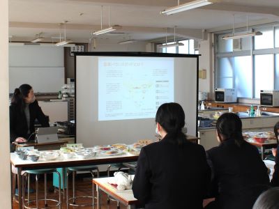 1月14日(水)14時50分より、愛媛川県立川之江高等学校で香川短期大学食物栄養学科の教員が出前講座「食育フード模型SATシステムを用いた食事診断~食事バランスガイドを用いて~」を行いました。講座を受けてくれたのは、普通科3年生の生徒18名の皆さんです。