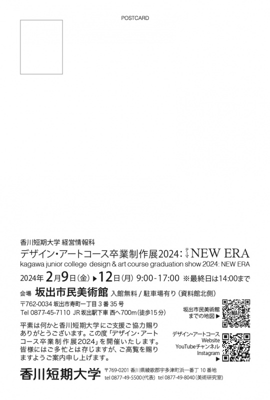 デザイン・アートコース卒業制作展2024″NEW ERA”開催 イベント 2024年1月26日 SNSでシェアする 香川短期大学デザイン・アートコース卒業制作展2024″NEW ERA”を以下の通り開催します。 ■期間:2024年2月9日(金)-2月12日(月) ■時間:9:00-17:00 ※最終日は14:00終了 ■会場:坂出市民美術館 ※入館無料/駐車場有り(資料館北側) ■住所:坂出市寿町一丁目3番35号 ご多忙とは存じますが、ご高覧を賜りますようご案内申し上げます。会場で皆さまにお会いできることを楽しみにお待ちしております。