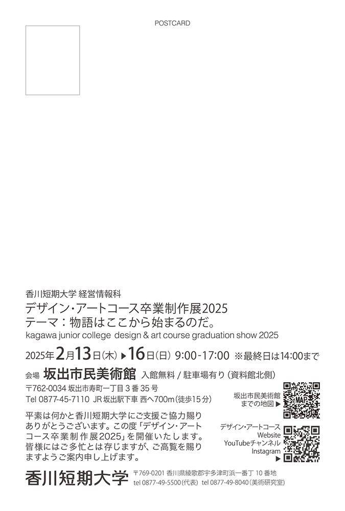 香川短期大学デザイン・アートコース卒業制作展2025『物語はここから始まるのだ。』を以下の通り開催します。