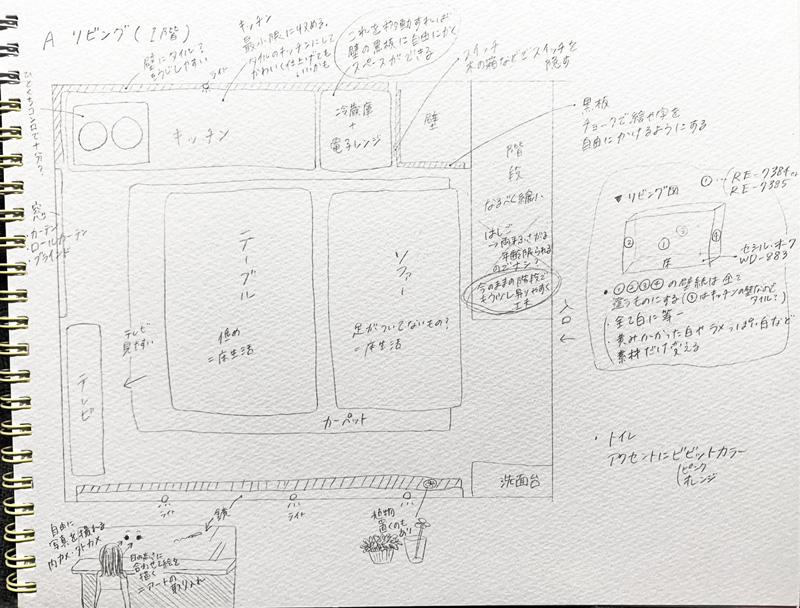 このペルソナに基づいて、1Fを全員での団らんや食事を行うリビングダイニングと位置づけ、2Fは2部屋あるため2パターンの全く違うくつろぎ方を提案しました。さらにこの3部屋それぞれをチーム化して、それぞれの部屋で他の部屋とは異なる世界観を描きながら3部屋全体のコンセプトをまとめました。このコンセプトに合わせてインテリアの詳細な仕様を決定しました。