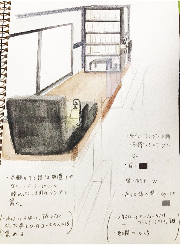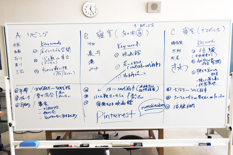その後、現況調査結果を基にしながら、実際にプロジェクトを進めていく上で重要なコンセプト決定(完成させる空間構成の方向性決定)のため、リノベーション後の利用客ペルソナ(完成後の対象ゲストハウスに宿泊するユーザー像)について全員で意見を出し合い、『20代の幼馴染女性4名』と決定しました。コンセプトやペルソナを決めるために何度も打合せを繰り返しましたが、コロナ禍での活動であるため、学内から全員で、またはいくつかのグループに区切ってのオンラインミーティングを実施しました。