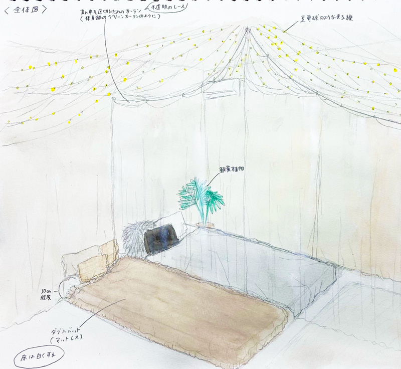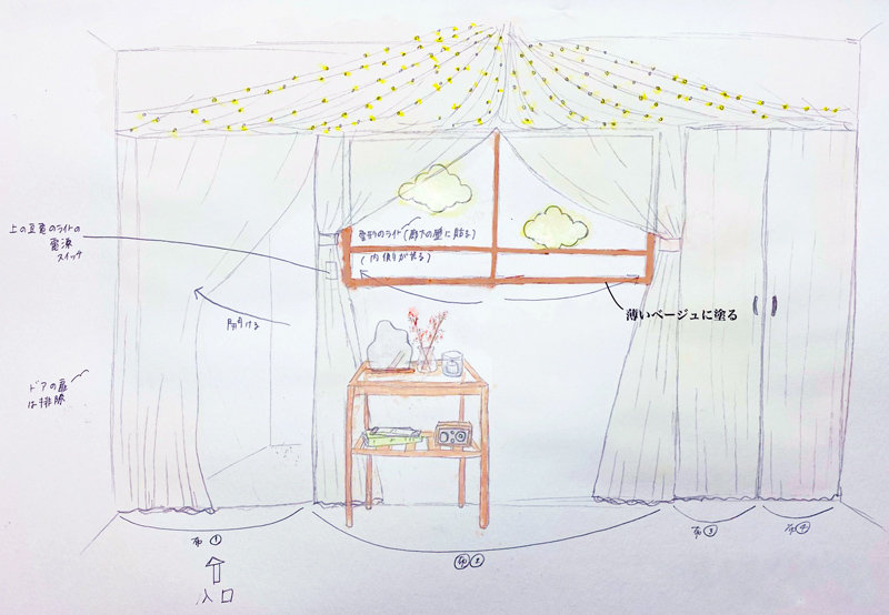 株式会社喜田建材様が所有する観音寺市にあるゲストハウスの1区画について、若者の感性を取り入れたこれまでにない発想のゲストハウスづくりを行いたいという試みから、本学デザイン・アートコースの学生9名のアイディアとデザインを再現するリノベーションプロジェクトを2020年11月から開始し、2022年3月末にこれらを具現化したゲストハウスが完成しました。