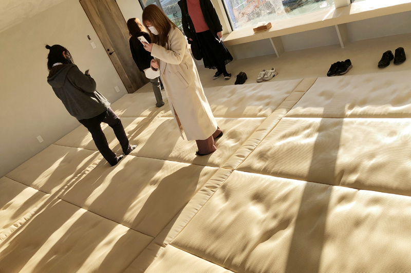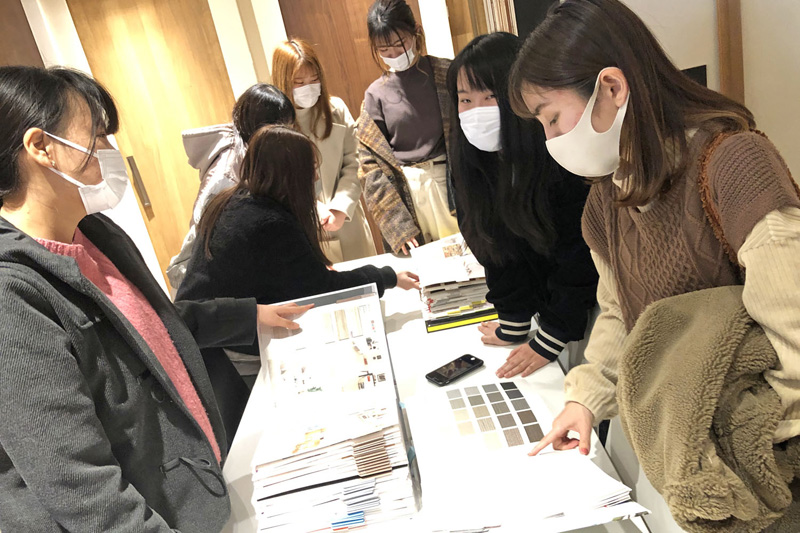 プロジェクト発足当初は対象となる部屋(1F:1部屋,2F:2部屋)の現況調査から始め、良い点と参加学生なりの改善点を挙げ課題をまとめていきました。これと並行して喜田建材様の保有する多くのゲストハウスを見学させて頂き、宿泊価格帯や想定する使用用途の違う物件を訪問するなかで、知見を広げていきました。特に建設中のオーシャンフロント大型ゲストハウスでは、そのロケーションに見合った空間構成や動線などを学び、居心地の良さやくつろぐことについて研究しました。