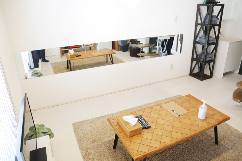 1Fは白を基調としたリラックスできるリビングダイニングとし、白く明るい空間に合わせた明るめのテーブルや形を統一した高さと素材の違うペンダントライトを設置し、壁一面にペルソナに基づいた宿泊客が並んでメイクが出来る長い特注の鏡を設置しました。
