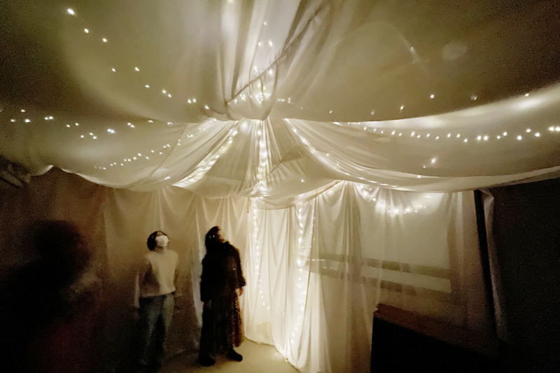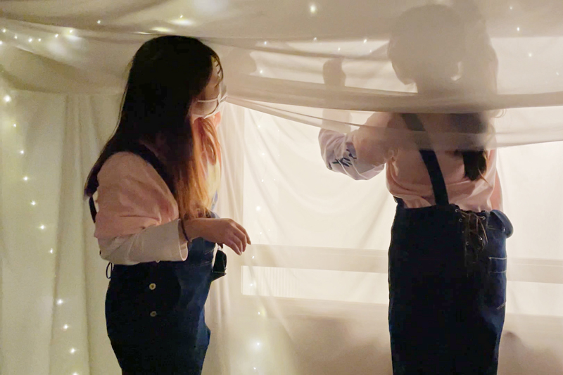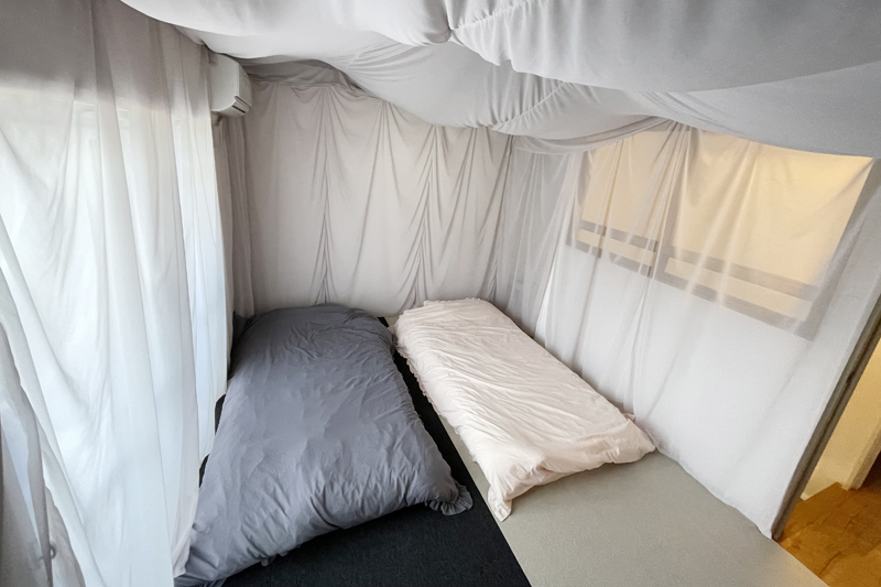 2Fは自分たちで選んだ生地を縫い合わせ、一枚の大きな布を製作し、たわみを計算しながら部屋中を覆い隠しお姫様の寝室のような天蓋(てんがい)を自分たちの手で設置しました。もう一方の部屋はパレットと呼ばれる建設現場で使用する木を組んだ台を床全面に敷き詰めその上から畳を床全面に隙間なく張り込みました。