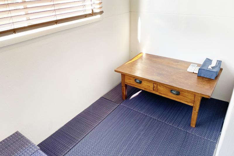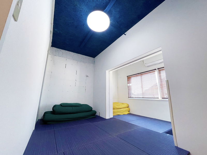 2F部屋01はパレットでかさ上げした畳敷きとし、天井は宇宙をイメージした青で仕上げ寝ころびながらリラックスできる空間構成を行いました。