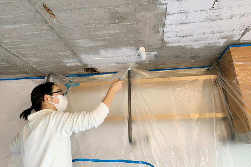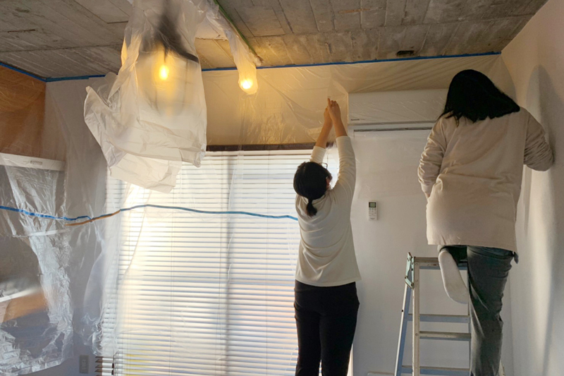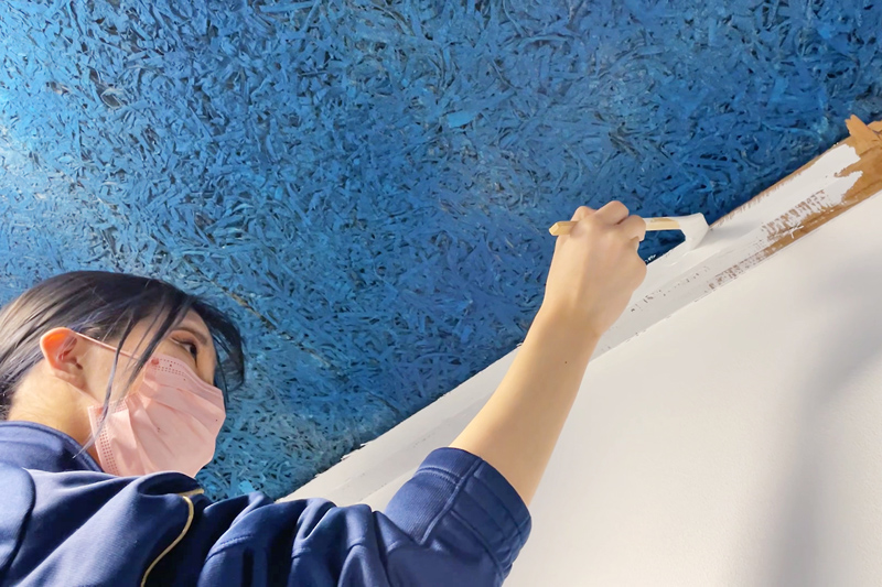 リノベーションに着手する際、部屋に用意するテーブルやクッションなどのプロダクト選定だけではなく、天井や床の塗装、天蓋(てんがい)作成と照明の設置、床のかさ上げなど、実際の工事の一部も職人さんの指導を受けながら、学生自らで作業を行わせてもらいました。