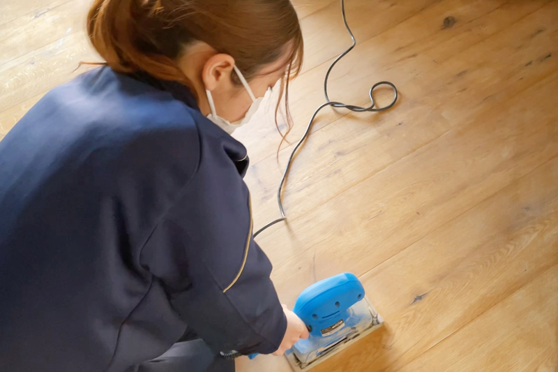 1Fは壁面を丁寧に養生した後、既存のコンクリート打ち放ち天井の上から白いペンキで塗装を行いました。次に深い茶色のオイルがしみ込んだ既存の床表面全面について電動のサンダーを使って表面のオイルが塗布された部分を削り、オイルを取り払った状態の床木材を白く塗装し、全体的にコンクリートと深めの木目で構成された渋い内装から白く明るめの内装へと雰囲気を一変させました。