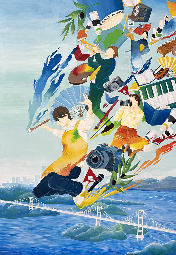 かがわ文化芸術祭2025ポスター原画募集で、デザインアートコース2年生の岡﨑心暖さんが最優秀賞を、同コース2年生の田中詠さんが優秀賞をそれぞれ受賞しました。本コース学生の最優秀賞受賞は、2014年から通算7人目。岡﨑心暖さんのポスター原画は本芸術祭オフィシャルポスター図案として採用され、県内外に発信されます。67回目となる、かがわ文化芸術祭2025は「かがわアーツ~オドロキの軌跡、そして未来へ~」をテーマに、令和7年10月1日から12月31日までの期間、県内各地で多彩なジャンルのアート表現に取り組みます。
