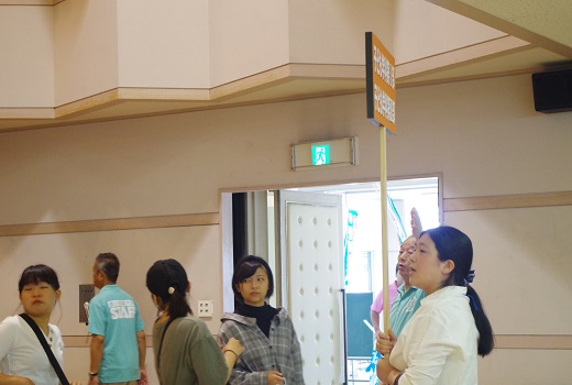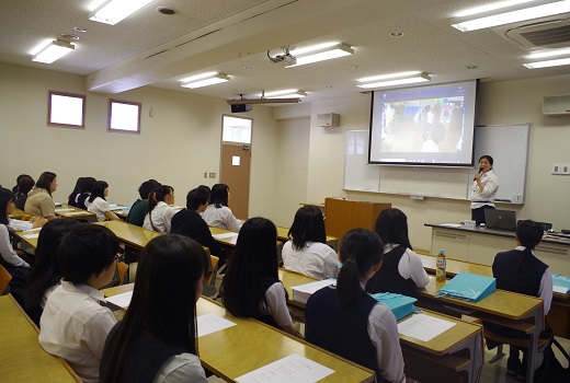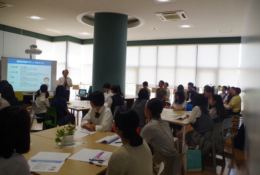 全体ガイダンスまでの待ち時間に大学生活をDVDでご紹介し、学生スタッフによる説明を聞いていただきました。20分の全体ガイダンス後、参加者の皆さんは各学科で催す模擬授業や体験コーナーで、様々な専門分野の体験をするとともに先輩学生と授業内容や学生生活、資格取得について楽しく懇談しました。